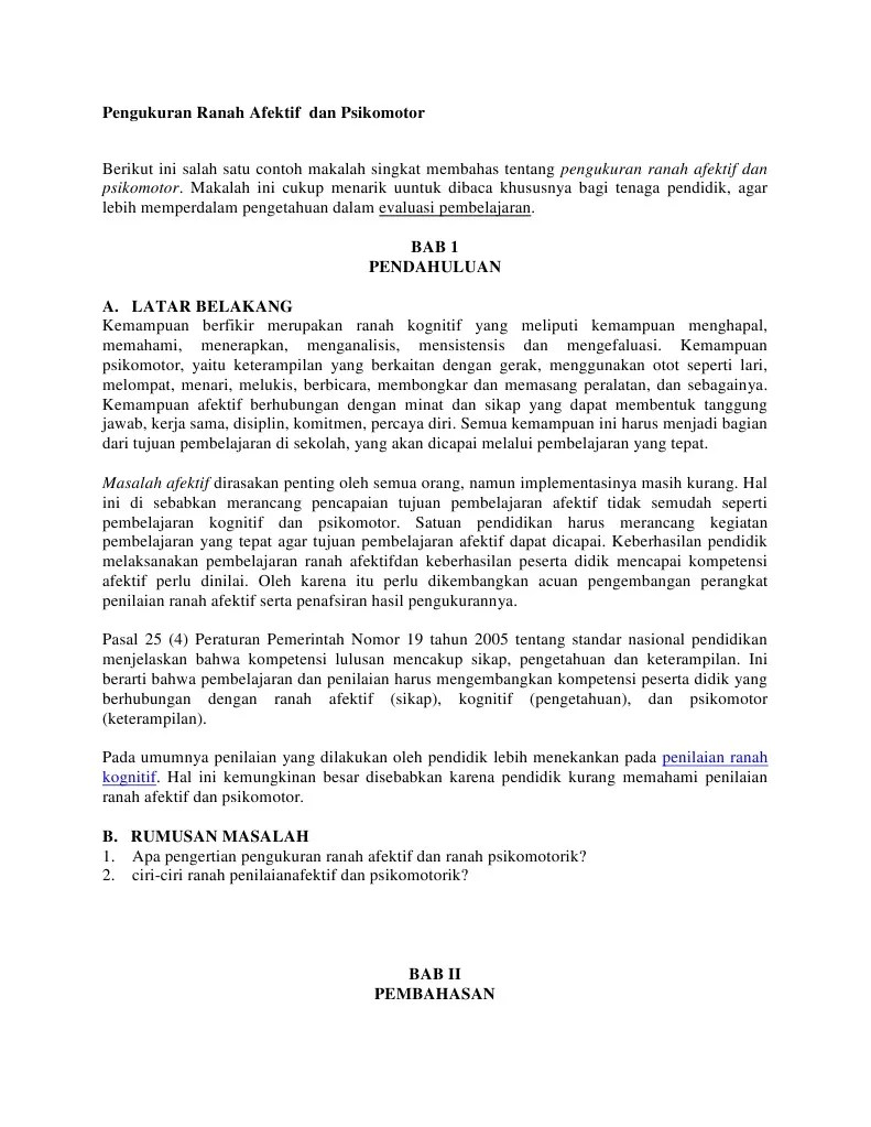 Salah satu contoh hasil belajar ranah kognitif pada jenjang pemahaman ini misalnya: Pengukuran ranah afektif dan psikomotor berikut ini salah satu contoh makalah. Memerlukan data hasil pengukuran dan informasi hasil penilaian yang memiliki banyak. Penilaian ranah afektif kemampuan afektif merupakan bagian dari hasil. Yaitu, domain kognitif, afektif, dan domain psikomotor.